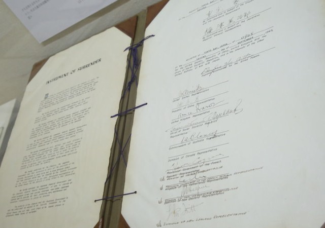 这是2015年9月1日在日本东京外务省外交史料馆内拍摄的日本二战无条件投降书原件。