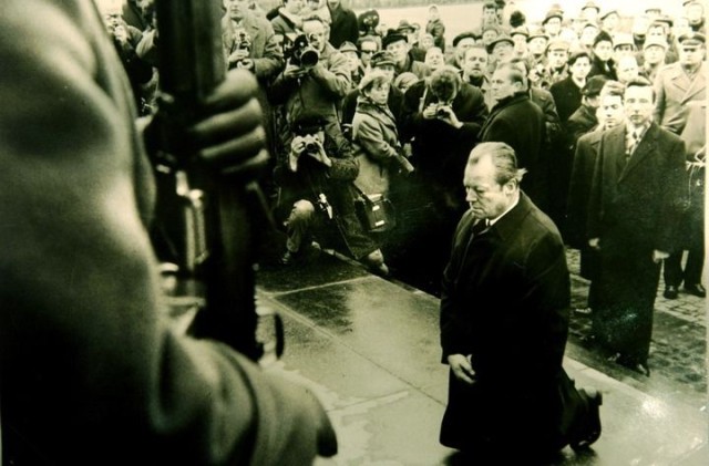 1970年12月7日,联邦德国总理勃兰特在波兰首都华沙犹太人殉难纪念碑前下跪。