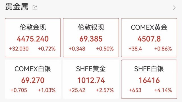 与此同时,COMEX黄金在相继突破4500美元/盎司、4510美元/盎司、4520美元/盎司关口后有所回落,截至发稿报4507.8美元/盎司,涨0.5%。