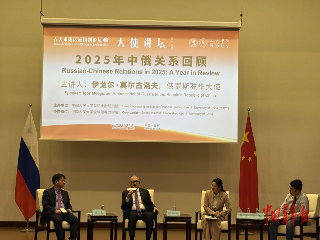 12月23日,北京,俄罗斯驻华大使伊戈尔·莫尔古洛夫(左二)出席中国人民大学重阳金融研究院举办的区域国别论坛之“大使讲坛”活动。中青报·中青网记者 马子倩/摄