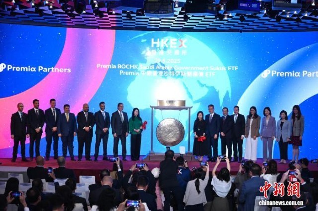 2025年5月29日,香港交易及结算所有限公司与沙特阿拉伯证券交易所集团在香港合办“香港——沙特资本市场论坛”。现场亦举行Premia中银香港沙特伊斯兰国债交易所买卖基金(ETF)在香港上市的敲锣仪式。图为香港特区政府财政司司长陈茂波(右七)等嘉宾出席敲锣仪式。 中新社记者 李志华 摄