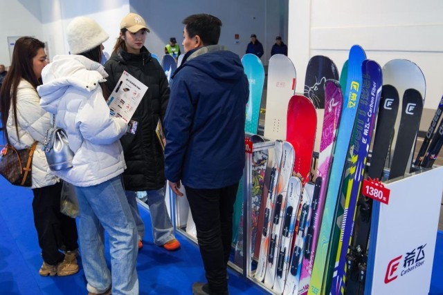12月18日,参观者在第九届吉林冰雪产业国际博览会现场参观展出的国产碳纤维滑雪板。新华社记者 许畅 摄