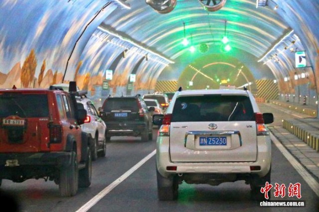 乌尉高速通车首日,车辆在天山胜利隧道穿行。苟继鹏 摄