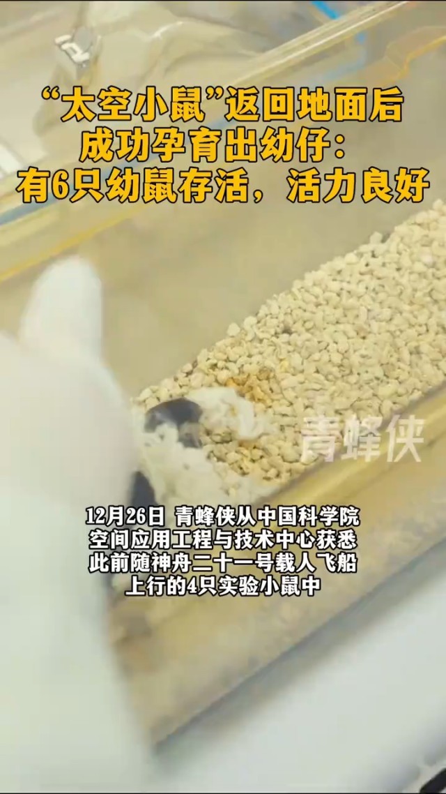 记者从中国科学院空间应用工程与技术中心获悉,此前随神舟二十一号载人飞船上行的4只实验小鼠中,1只雌鼠和1只雄鼠返回地面后交配,雌鼠12月10日6时许顺利产下9只幼仔,其中6只幼鼠存活,存活率正常。这窝“太空小鼠后代”目前在科研人员的精心呵护下茁壮成长。