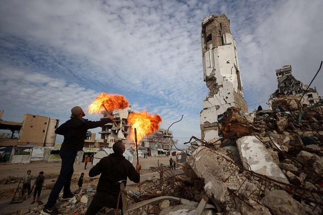 2025年12月31日,加沙城,流离失所的巴勒斯坦青年在一座被毁建筑的废墟上表演火焰秀迎接新年。视觉中国供图