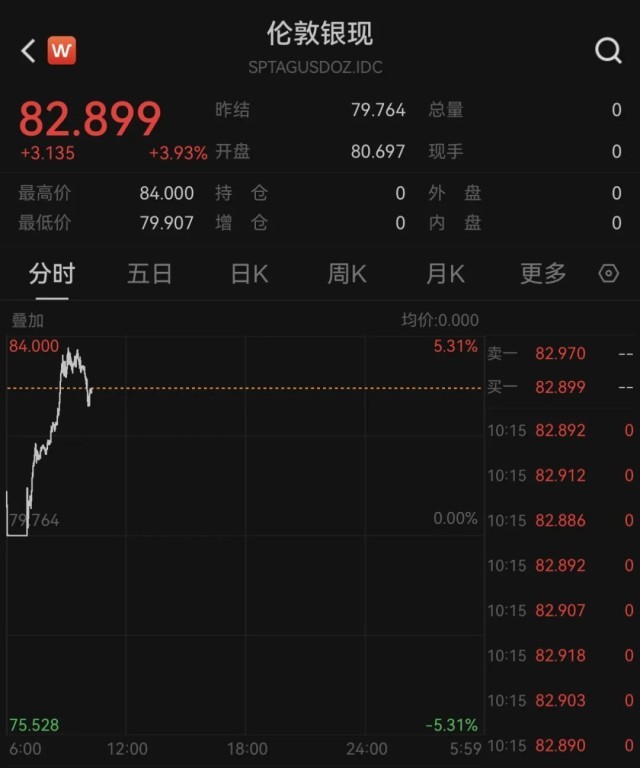 现货白银涨近5%,站上84美元关口,强势突破两周前高点续创历史新高。COMEX白银大涨逾5%逼近84美元。