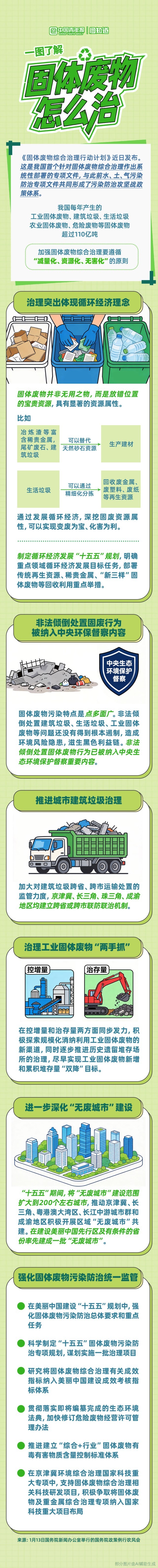 我国每年产生的固体废物超过110亿吨,治理固体废物带来的污染等问题,是世界性难题。近日,《固体废物综合治理行动计划》发布。固体废物如何治?一图了解。