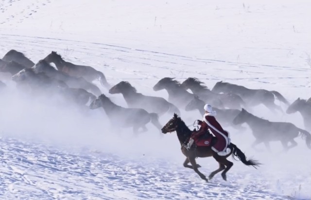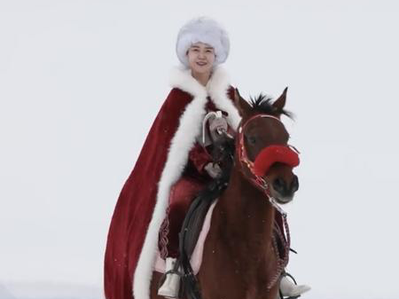 2026年元旦该账号发布的第一条视频,画面中依然是在皑皑白雪中骑马奔驰的贺娇龙,视频配文:保持马不停蹄的干劲,一起为梦想奋斗、为幸福打拼。