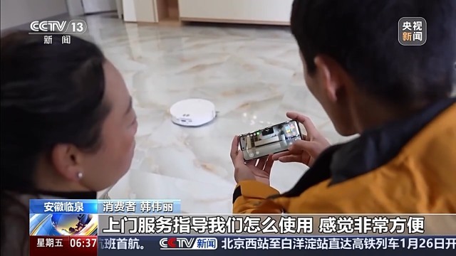 消费者 韩伟丽:新添了一个扫地机器人,上午在电商服务站下单,下午就给我们送到家了,上门服务指导我们怎么使用,感觉非常方便。