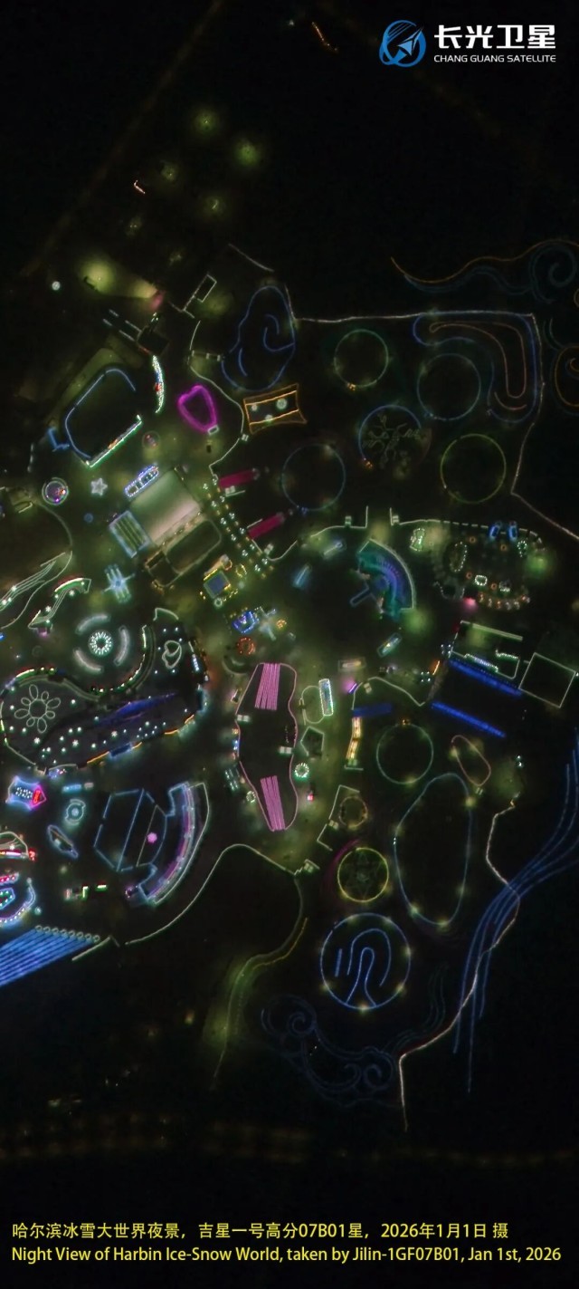 该影像呈现的是元旦当晚哈尔滨冰雪大世界园区。在夜光成像模式下,“吉星”高分07系列卫星可获取幅宽15千米的高空间分辨率、高无控定位精度夜光推扫影像,实现对单个路灯照明区域良好成像。