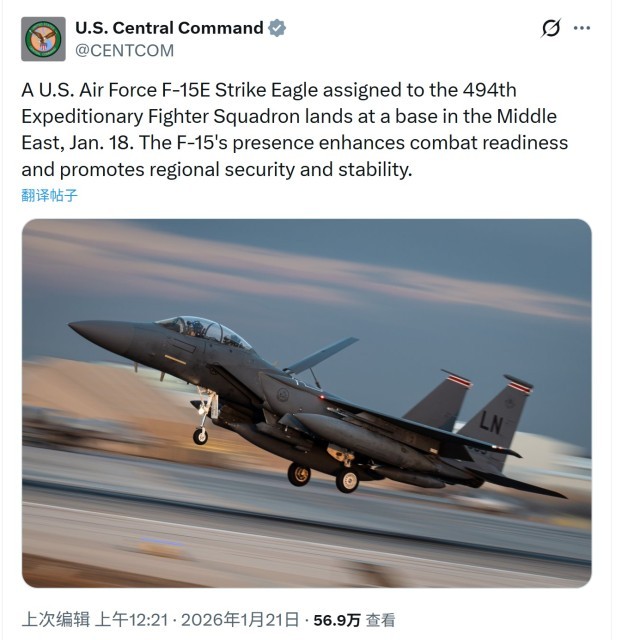 1月21日,美军中央司令部宣布,增援中东的F-15E战机已经抵达。 社交媒体平台“X”截图