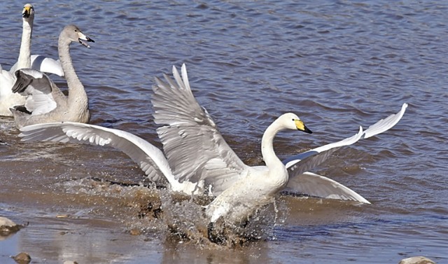 天鹅在北京密云水库流域的清水河中嬉戏。新华社发