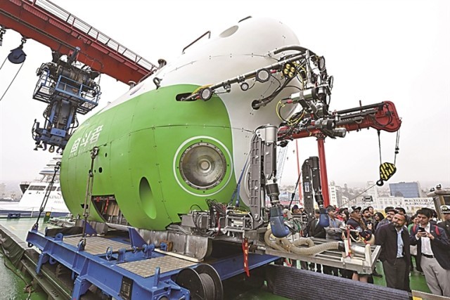 在停靠于智利中部瓦尔帕莱索港的中国“探索一号”科考船上,人们参观“奋斗者”号载人潜水器。新华社发