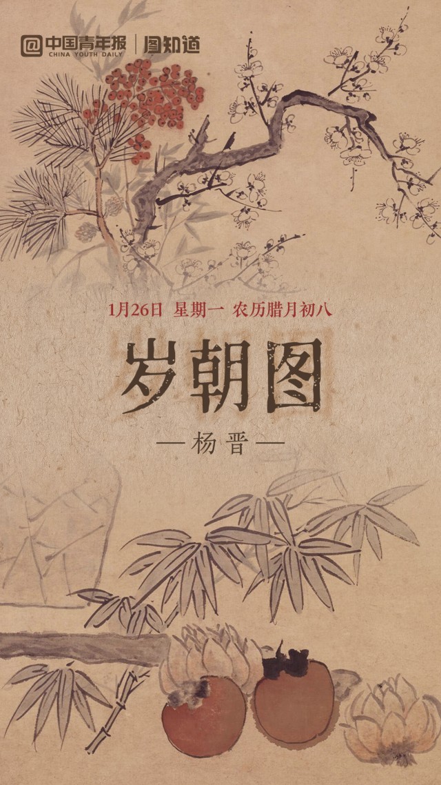 今天是1月26日,星期一,农历腊月初八,腊八节。清代杨晋的《岁朝图》绘岁寒三友松竹梅,佐以如意竹枝、红柿入画,集“平安、长寿、富贵”之美好寓意。正值腊八,借此祥瑞之景,伴着温润粥香,愿君纳福迎祥,岁岁安康。早安,朋友!(文案/朱梓轩 AI生成、剪辑/董怡璇)
