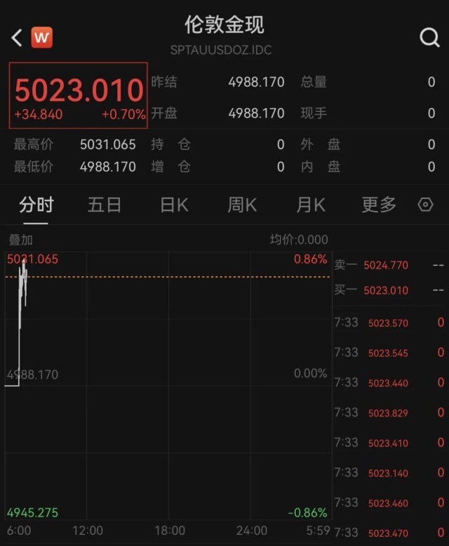 26日早间,现货黄金直线拉涨,盘中首次突破5000美元/盎司,再创历史新高。截至发稿,报5023.010美元/盎司,涨0.70%。