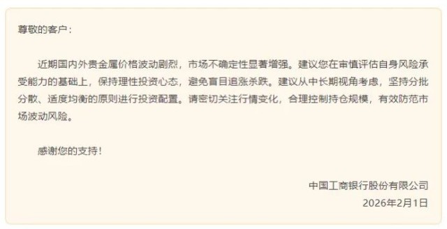 国内外贵金属价格剧烈波动,2月1日,工商银行再次紧急发布风险提示。