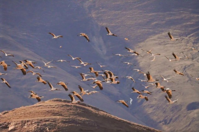 黑颈鹤有着修长的脖颈和双腿,全身灰白相间,头顶一抹红色格外醒目。它们在田野间悠然觅食,时而翩翩起舞,时而引颈高歌,形成一幅动人的生态画卷。