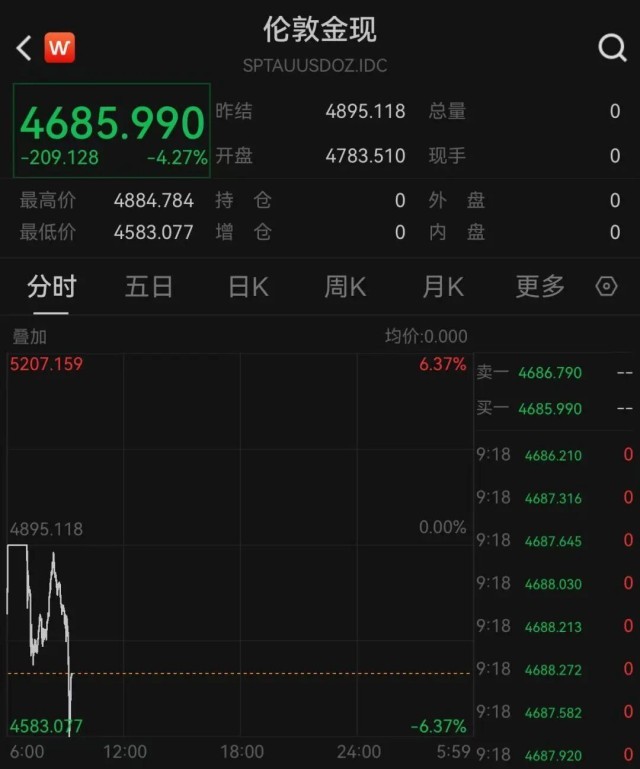 Wind数据显示,截至北京时间2月2日9:18,伦敦现货黄金报4685.99美元/盎司,跌超4.2%,日内最低触及4583.077美元/盎司;伦敦现货白银报82.887美元/盎司,跌超2.7%。