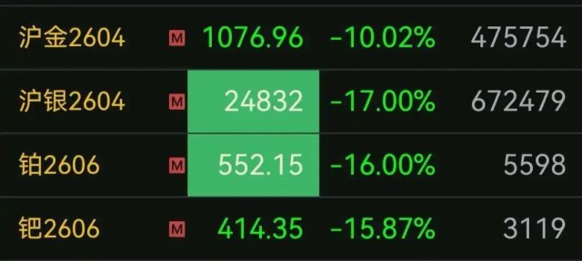 2月2日,国内贵金属期货价格开盘普跌。文华财经数据显示,截至9:04,沪银期货主力合约跌停,沪金期货主力合约跌超10%,铂期货主力合约跌停,钯期货主力合约跌超15%。