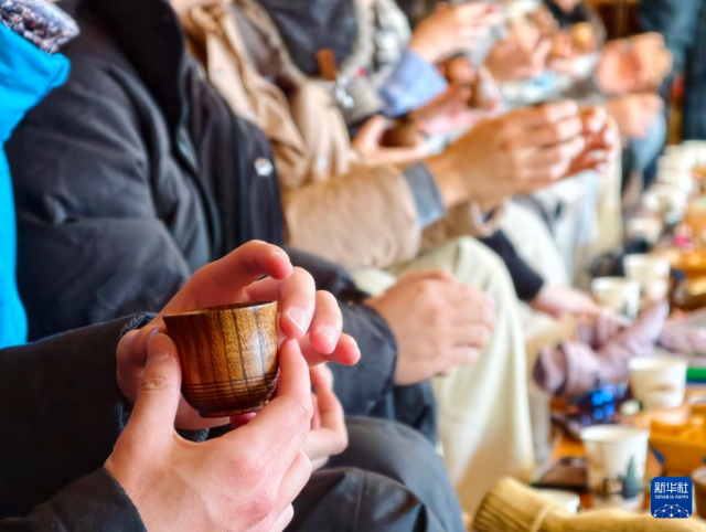 1月30日,台湾青年在新疆喀纳斯景区的蒙古族图瓦人木屋里品尝奶酒。新华社记者 贺小童 摄