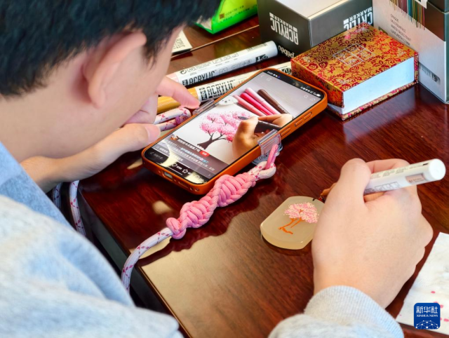 1月31日,台湾青年在位于新疆北屯市的北屯职业技术学校体验金丝玉手绘。新华社记者 贺小童 摄