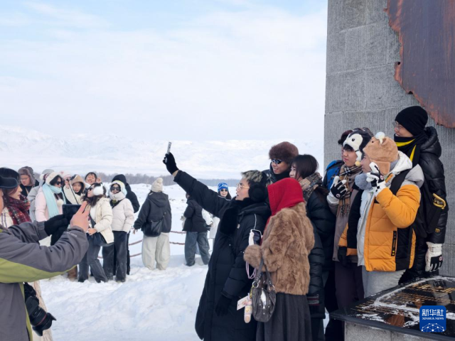 1月29日,台湾青年在位于新疆阿勒泰地区哈巴河县的西北之北纪念碑前合影。新华社记者 贺小童 摄