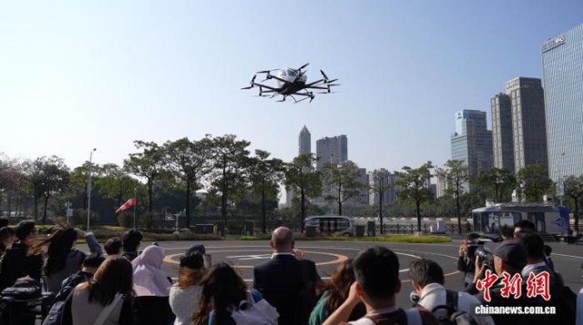 2月2日,广东广州,亚太经合组织(APEC)第一次高官会及相关会议参会代表参观飞行汽车。中新社记者 韦杰夫 摄