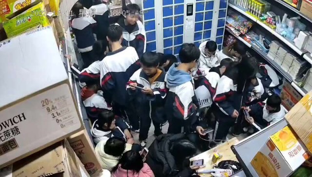2023年12月,校门口一小卖部里,挤满了玩手机的学生。(监控画面)受访者供图