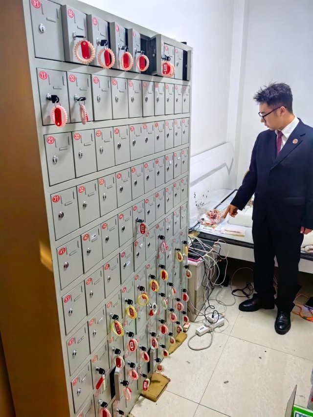 办案人员前往该商铺核查,发现了秘密——商店内有一扇被货架遮挡的小门,推门而入,里面有一个专门存放手机的不锈钢柜子,柜子被分成100个小格子,每个格子都配有插座。