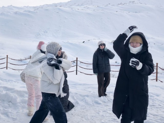 1月29日,台湾青年在新疆西北之北纪念碑前打雪仗。新华社记者 贺小童 摄