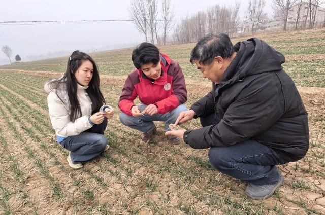 1月31日早上,中国农业大学曲周实验站研究生李康宁、龚若鱼和北油村种粮大户吕桂生一起察看苗情。农民日报全媒体记者 李杰 摄