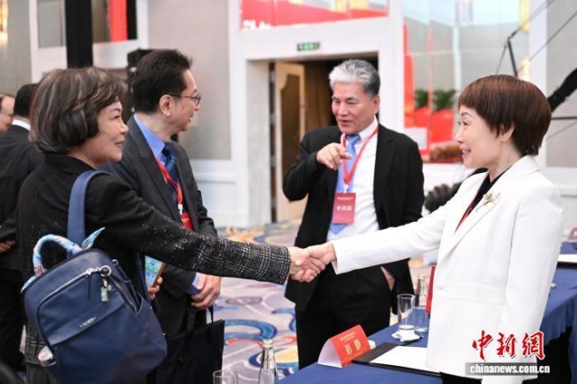 2月3日,国共两党智库论坛在北京举行,与会嘉宾握手致意。中新社记者 赵文宇 摄