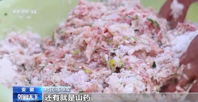大酥鸡名为“鸡”,食材却历经变化。据《阜阳民俗志》记载,这道菜始见于清代中后期,最初的确是用鸡做主料,但名随旧制,菜有创新。在漫长的岁月里,随着人们口味的变化,如今的大酥鸡用肥瘦均匀的猪后腿肉做主料。厨师把猪肉剁成细腻肉末,山药拍成泥,前一天蒸制的凉馍揉成细碎馍花,三种食材与蛋液、调料混合,是大酥鸡酥软鲜香的核心。