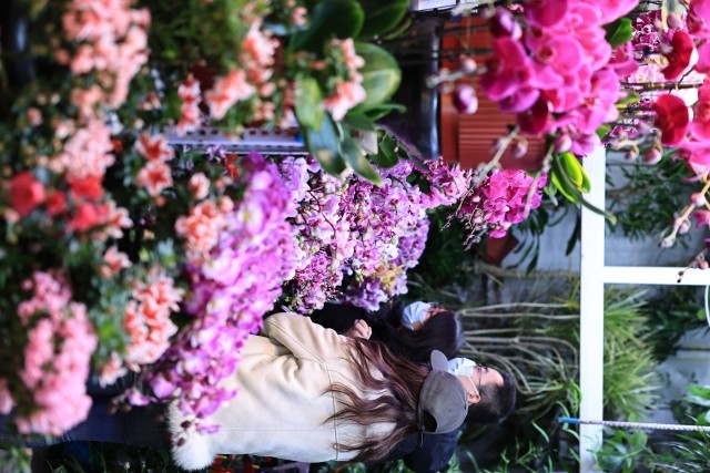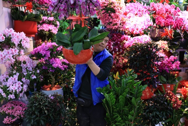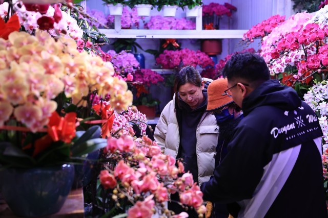 众多花卉中,富有美好寓意的品种尤其受欢迎。在花商刘女士的摊位上,各色兜兰开得正盛。“每天能卖出几十盆,比月初翻了几番。”她笑着说,“很多顾客冲着‘兜住福气’的好彩头来买,每年春节前都是这样。”