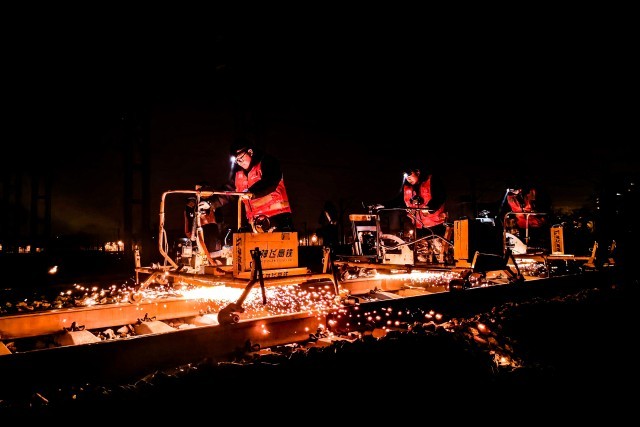 深夜里北京南站火光四射,打磨小队作业人员正在打磨钢轨,他们几乎都是95后、00后。中青在线记者 陈思阳/摄