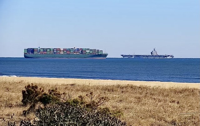 在诺福克海军基地附近活动的“布什”号航母(右)。 图片来源 社交媒体平台“X”