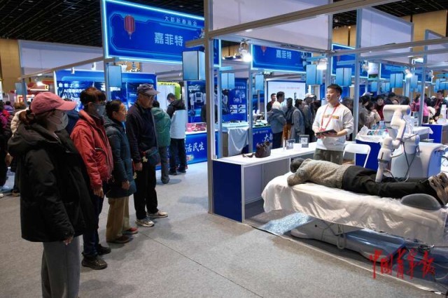 2月18日,北京,国家会议中心二期,2026大都新春庙会,展台内的康养理疗机器人吸引不少老人的关注。中青报·中青网记者 田嘉硕/摄