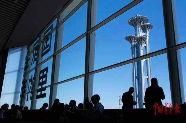 2月18日,北京,国家会议中心二期,2026大都新春庙会,游客在窗户边休息。中青报·中青网记者 田嘉硕/摄