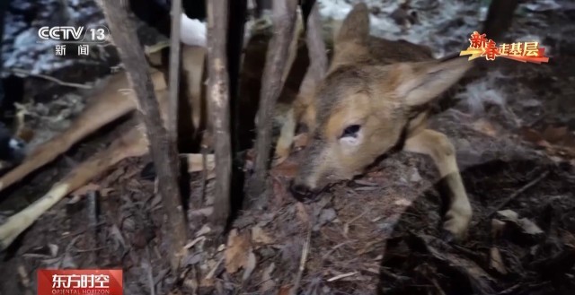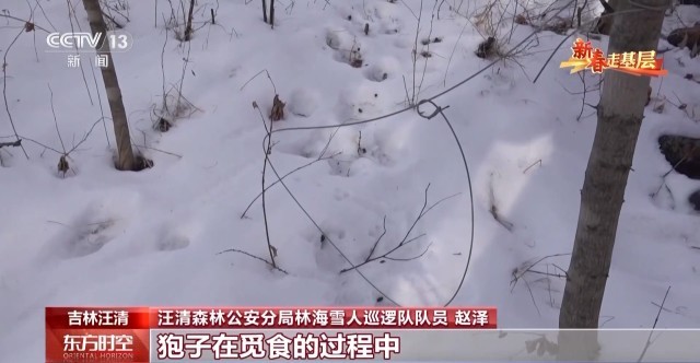 汪清森林公安分局林海雪人巡逻队队员 赵泽:狍子在觅食的过程中,低头走路吃东西,头一伸进去之后,就往前或者往左右一拽。头、脖子就被勒住了。