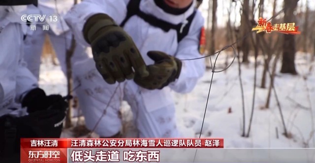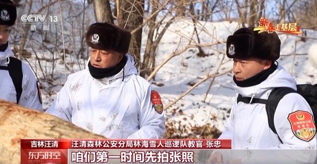 汪清森林公安分局林海雪人巡逻队队员 赵子越:原地不动,然后往后撤。倒着往后撤,你不要转身背对着它往外跑。一点点往后撤,我们离它保持一定安全距离以后,我们再放一些鞭炮什么的。
