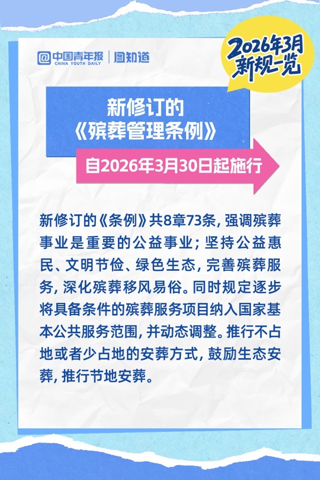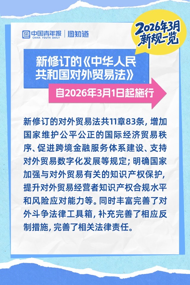 新修订的对外贸易法促进跨境金融服务体系建设,新修订的《殡葬管理条例》强调公益惠民,直播电商食品安全有据可依,未成年人网络信息分类管理……2026年3月,这些新规正式施行,件件关乎你我生活。