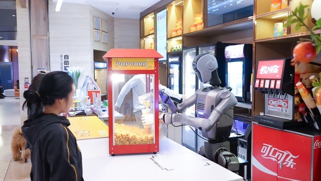 “滴——识别成功,开始制作。”深圳K11影院的爆米花柜台前,人形机器人抓起一只空纸杯,对准出料口,金黄的爆米花簌簌落入杯中,不多不少恰好至刻度线。封口、递送,动作虽机械但流畅。