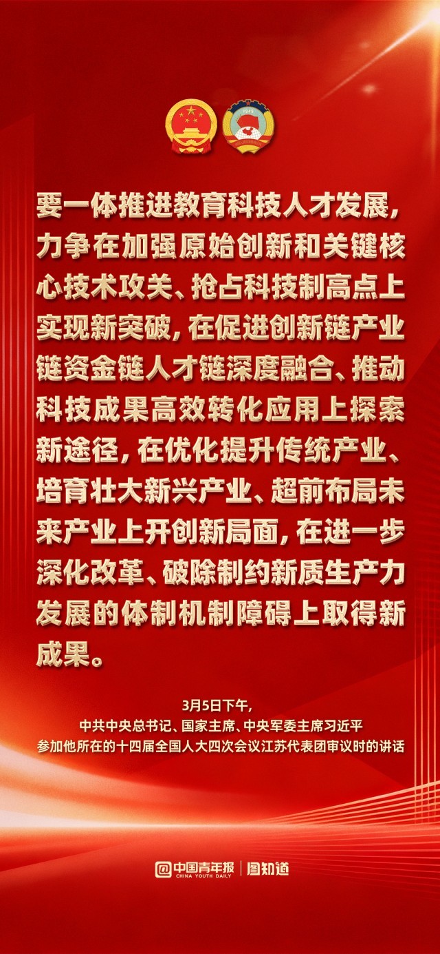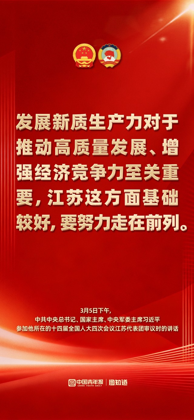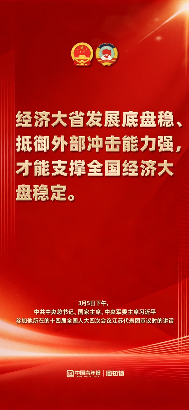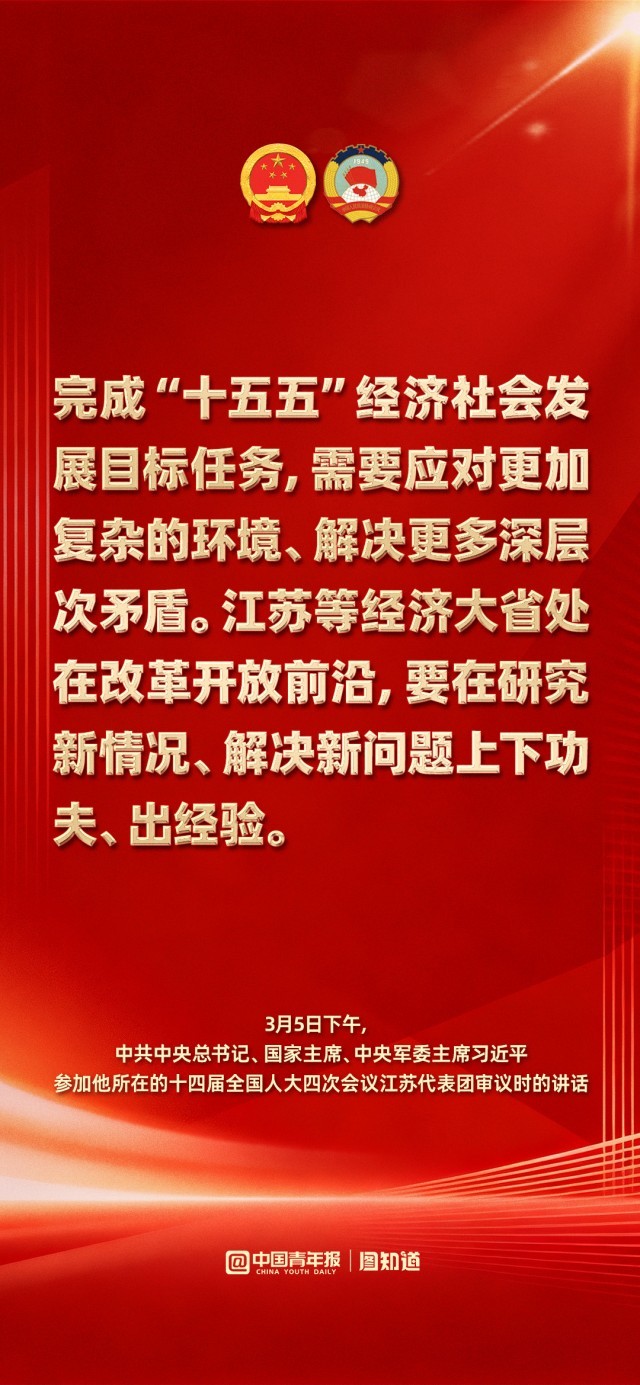 3月5日下午,中共中央总书记、国家主席、中央军委主席习近平在参加他所在的十四届全国人大四次会议江苏代表团审议时强调,完成“十五五”经济社会发展目标任务,需要应对更加复杂的环境、解决更多深层次矛盾。江苏等经济大省处在改革开放前沿,要在研究新情况、解决新问题上下功夫、出经验。