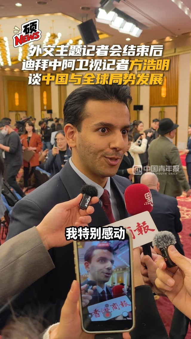 3月8日,十四届全国人大四次会议举行外交主题记者会。会后,伊拉克籍、迪拜中阿卫视驻华记者方浩明接受记者采访,谈中国与全球局势发展等相关问题,他说,中国在为中东局势想办法,“我特别感动。”(拍摄/中青报·中青网记者 田嘉硕 视频制作/中青报·中青网见习记者 董怡璇)