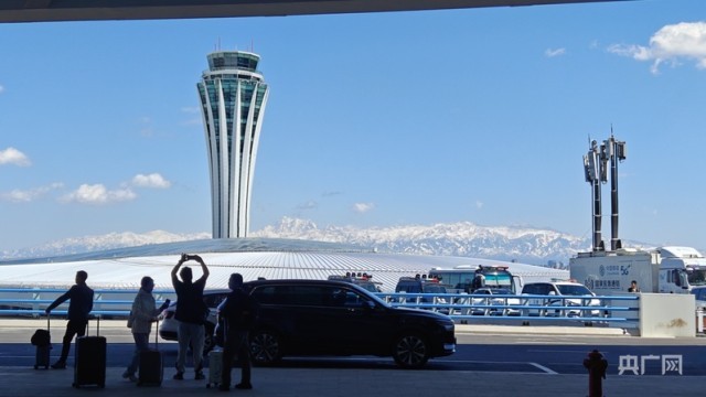 旅客在乌鲁木齐天山国际机场航站楼前拍照留念 (央广网记者 郭璁悦 摄)