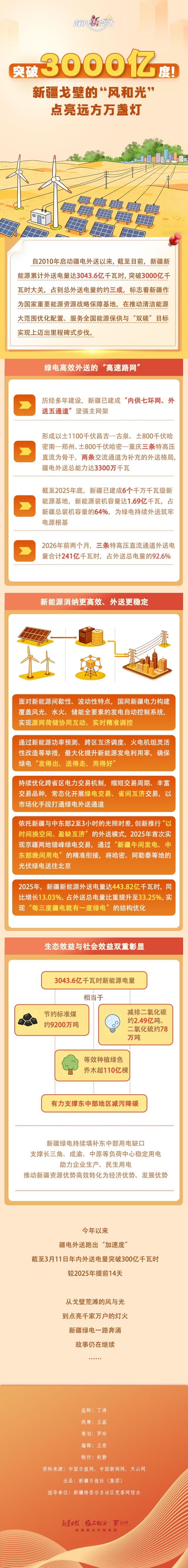 自2010年启动疆电外送以来,截至目前,新疆新能源累计外送电量达3043.6亿千瓦时,占新疆总外送电量的约三成。这些穿越山河的清洁能源,不仅保障着中东部地区的灯火通明,也在为全国实现“双碳”目标输送着源源不断的“新疆力量”。本期《数说“新”变化》带你透过数据看“绿电出疆记”。