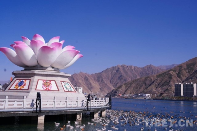 现代化的城市楼宇与连绵的群山相依,成群的斑头雁、赤麻鸭在拉萨河中游弋,勾勒出人与自然和谐共生的高原图景。 摄影:张艺彤