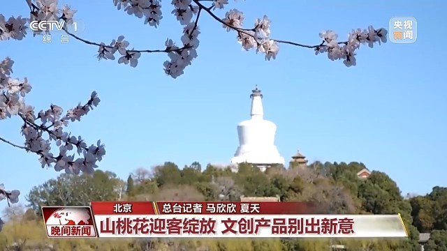 除了城市滨水空间外,北京市各大公园的山桃花也次第绽放,结合历史建筑,形成独具韵味的春日景观。北海公园推出了限定山桃花主题饮品和冰箱贴,在阳光下熠熠生辉。