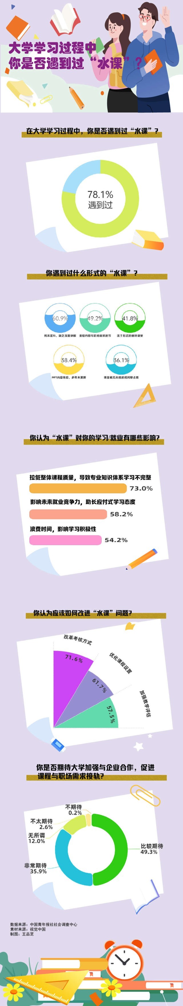 课堂PPT陈旧、课程内容与职场需求脱节、教师敷衍教学……大学生们,这些情况你遇到过吗?你希望如何减少“水课”?中国青年报社社会调查中心的一项调查显示,对“水课”说“不”,71.6%的受访者期待改革考核方式,改善教师“重科研轻教学”现象,61.7%的受访者期待优化课程设置,增强实用性。