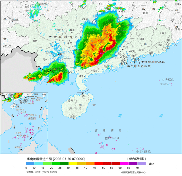 3月30日凌晨,新一轮强对流天气又从广西发展起来,并且逐渐东移,在上午形成带状强回波影响广东。